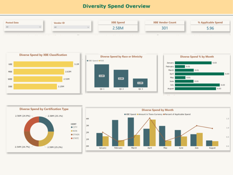 Track vendor certifications (MBE, WBE, DBE), spending trends, and regional participation to meet diversity goals and compliance requirements.