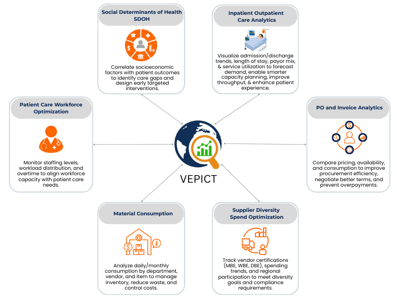 VEPICT (Value-Enabled Process Intelligence & Cognitive Transformation) empowers hospitals, public health systems, and care providers with real-time, AI-powered analytics.